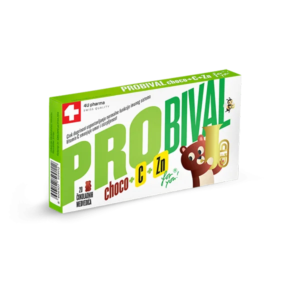 Probival Choco + C + Zn for you! чоколадните мечиња содржат уникатна формулација на култури на корисни микроорганизми Lactobacillus acidophilus и Bifidobacterium lactis и инулин, наменети за имунитет и микрофлора на децата. Не содржи глутен, конзерванси или додадени шеќери. Lactobacillus acidophilus и Bifidobacterium lactis се млечно киселински бактерии и бифидобактерии. Тие се природни жители на цревниот тракт и најдобро тестираните добри бактерии. Инулинот е растително влакно кое ги храни добрите бактерии и учествува во обновувањето на микрофлората преку заедничко делување со нив.