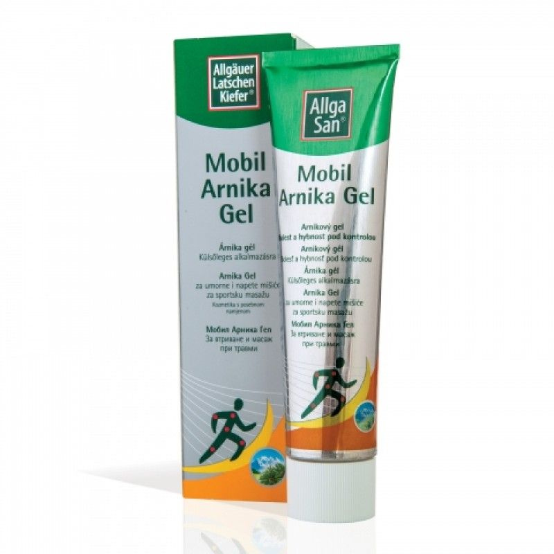 Allga San Mobil Arnika гел за релаксирачка масажа 100ml. Allga San арника гелот продира длабоко во кожата ја намалува напнатоста и болките. Се користи кај контузија, тапи повреди, истегнувања и исчашувања. Помага при повреди на мускулите, тетивите и зглобовите. Ги намалува отоците и ги лади болните места. Погоден е за спортска масажа на вкочаните мускули и зглобови. Брзо се впива и не ја масти кожата.