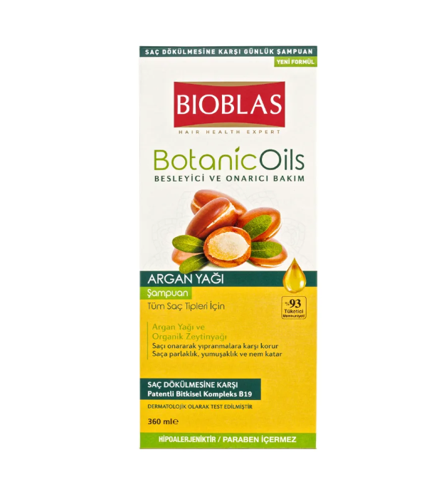 Bioblas Argan Shampoo ја негува косата од корен до врв со својата билна формула, специјално развиена за борба против опаѓањето на косата. Аргановото масло длабински ја хидрира косата, додавајќи и сјај и мекост, додека маслото од маслинка, богато со антиоксиданси, ги штити влакната од надворешни фактори и ја зголемува еластичноста. Неговата билна формула нежно го чисти скалпот, истовремено грижејќи се за него без да ја наруши природната рамнотежа на влага. Со редовна употреба, косата станува пообемна, повитална и поцврста.