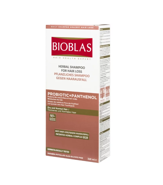 Bioblas Probiotic & Panthenol Shampoo внимателно ја штити природната флора на скалпот благодарение на пробиотиците, додека пантенолот (провитамин B5) ја хидрира и омекнува структурата на косата, додавајќи сјај и еластичност. Клинички тестиран билен комплекс B19 ефективно ја спречува косопадот и ја потхранува косата. Формулата е нежна — без сулфати, парабени и фталати — и идеална за секојдневна употреба, особено за чувствителен или третитиран скалп. Со редовна употреба, косата е појака, поздравa и витална. Пробиотиците ги балансираат и штитат природните флори на скалпот, спречуваат сушење и непријатности. Пантенолот (провитамин B5) длабински ја хидрира косата, ја успокорува, правејќи ја мека и еластична, со враќање на природниот сјај