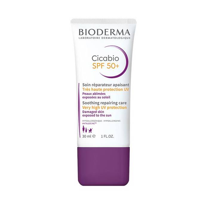Обновувачки крем со многу висока заштита од сонце, за превенција на хиперпигментации од лузни, за целото семејство Cicabio SPF 50+ помага да се регенерира оштетената кожа изложена на сонце дејствувајќи на секоја фаза од биолошкиот епидермален реконструкциски процес и ограничувајќи го ризикот од хиперпигментација (темни дамки) на местата од лузните. Синергистичката комбинација на ресвератрол, бакар и centella asiatica ја забрзува обновата на епидермисот. Многу високата УВ заштита (СПФ 50+) го ограничува ризикот од хиперпигментација. Анти-бактериските агенси (бакар и цинк) го прочистуваат епидермисот. ANTALGICINE™ брзо го олеснува чувството на непријатност и ја намалува потребата од чешање. Неговата хидратантна и заштитна текстура, базирана на хијалуронска киселина, не лепи, не е мрсна и ја прави удобна кожата.