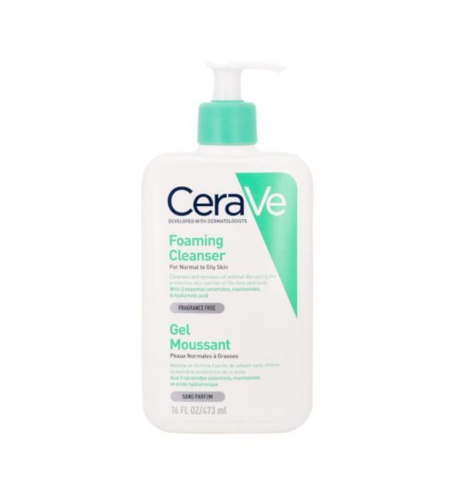 CeraVe Foaming Cleanser – Пенлив гел за чистење Наменет за нормална до масна кожа. Ефикасно ја чисти кожата и го отстранува вишокот себум, без да ја наруши нејзината природна заштитна бариера, како на лицето така и на телото. Формулата содржи 3 есенцијални церамиди, ниацинамид и хијалуронска киселина, кои помагаат во одржување на хидратацијата и зајакнување на кожната бариера. Без додаден мирис. Хипоалергена формула, погодна за чувствителна кожа.