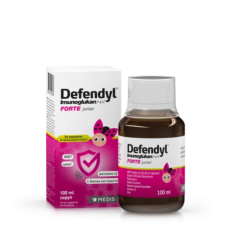 Вкусен производ за краткотрајна поддршка на имунолошкиот систем кај зголемени потреби на детскиот организам. Единствена комбинација на IMG® од буковка, витамин Ц, цинк и билни екстракти за кои има докажано позитивно дејство на имунолошкиот систем и респираторниот систем. За кого е наменет Defendyl-Imunoglukan P4H® FORTE junior? Го препорачуваме кај деца: за брзо и силно зајакнување на имунитетот кај првите знаци на пад на отпорноста веднаш штом ќе забележиме први симптоми на настинка или други инфекции на респираторниот систем за краткотрајна поддршка кај зголемена потреба на организмот