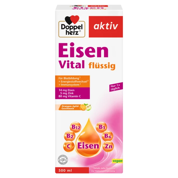 Железото е витален микроелемент кој е потребен за многу функции во телото. Придонесува за нормално формирање на црвени крвни зрнца и хемоглобин, црвениот крвен пигмент и го поддржува нормалниот транспорт на кислород во крвта. Покрај тоа, железото игра улога во нормалниот енергетски метаболизам и клеточната делба. Железото придонесува и за нормално функционирање на имунолошкиот систем. Нашето тело не може само да произведе железо и секој ден губи одредена количина. Затоа, треба редовно и доволно да го снабдувате овој витален микроелемент преку храната. Треба да се обрне особено внимание на соодветно снабдување со железо во развојните години, за време на бременоста, доењето, во староста и во случај на неурамнотежена или вегетаријанска исхрана. Железото придонесува за нормално формирање на црвените крвни зрнца и ја поддржува нормалната функција на имунолошкиот систем. Витаминот Б12 помага да се намали заморот. Витаминот Б1 придонесува за нормална работа на срцето. Витамините Б (Б1, Б2, Б6, Б12) придонесуваат за нормално функционирање на нервниот систем и нормален метаболизам што дава енергија. Витаминот Ц ја зголемува апсорпцијата на железо, придонесува за нормално функционирање на имунолошкиот систем и ги штити клетките од оксидативен стрес. Сеопфатниот цинк ја поддржува клеточната делба и обезбедува нормално функционирање на имунолошкиот систем и ги штити клетките од оксидативен стрес. Да се користи доколку има зголемена потреба од железо. Doppelherz Eisen Vital содржи железо во форма на железо(II) глуконат и комбинација од 4-Б витамини, како и витамин Ц и цинк. Додатокот во исхраната има овошен вкус на портокал со јаболко, а погоден е и за вегетаријанци и вегани!