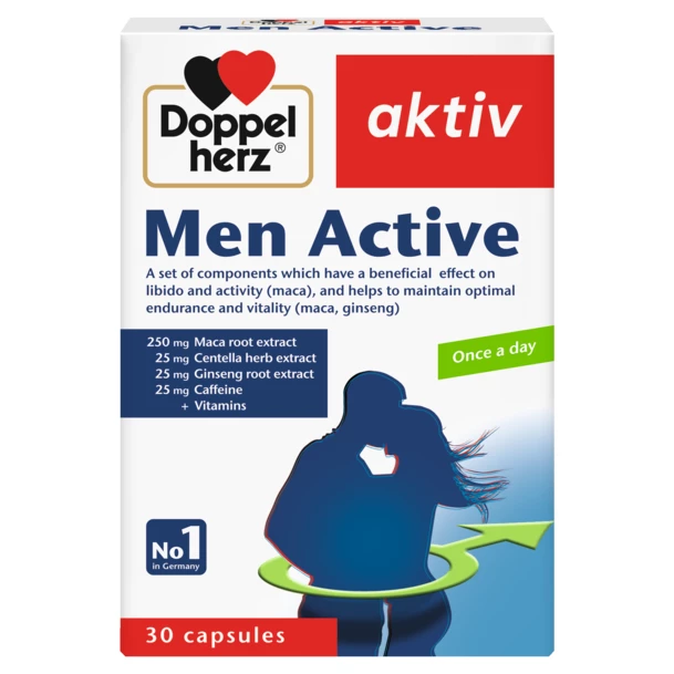 Ја поддржува сексуалната активност на мажите Постојаната побарувачка за перформанси во нашето современо општество може да стане вистинска трка за успех во професионалниот, но и во приватниот живот. Притисокот е толку висок што дури и љубовниот чин е насочен од желбата за успех. Кога постарите мажи одвреме-навреме се предмет на мали „неуспеси“, тогаш разочарувањето е дотолку поголемо. Ова често резултира со фрустрација и анксиозност што може да придонесе за појава на умерена еректилна дисфункција. За мажите кои страдаат од вакви неволји, Doppelherz® aktiv го создаде Мен Актив од избор на билни екстракти, витамини и минерали познати по нивното благотворно дејство на машкиот репродуктивен тракт. Men Active од Doppelherz® делува на две нивоа: краткорочно, кофеинот и женшенот имаат стимулирачки и енергетски ефект, Gotu cola ја зголемува периферната циркулација која ги снабдува со крв половите органи, а Маката делува на метаболизмот на азотен оксид, кој се ослободува. по сексуална стимулација за иницирање на ерекција на пенисот. На долг рок Маката има позитивно влијание врз расположението и умот со ублажување на перцепцијата на стресот и затоа помага да се врати самодовербата. Покрај тоа, Маката содржи високи количини на аргинин, фитостероли, флавоноиди и танини кои позитивно влијаат на циркулаторниот систем, спроводливоста на нервните импулси и квалитетот на спермата. Цинкот помага во одржување на покачени нивоа на тестостерон, а селенот и витаминот Е се важни за формирање на спермата. Men Active од Doppelherz®: за мажи кои страдаат од еректилна дисфункција и оние кои сакаат да ја подобрат својата сексуална потенција и нивното либидо.
