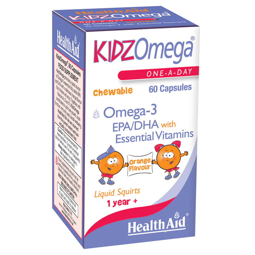KidzOmega капсулите ™ се одличен извор на омега-3 есенцијални масни киселини EPA и DHA. E икосапентаеноичната киселина (EPA) и докозахексаеноичната киселина (DHA) придонесуваат за нормална функција на срцето и мозокот и нормален вид. KidzOmega капсулите ™ се збогатени со витамини А, Д и Е за да имаат корист за здравјето на вашето дете. KidzOmega ™ е висококвалитетна форма на рибино масло, ослободена од сите нечистотии и токсини, обезбедувајќи подобрено варење, апсорпција и ефикасност