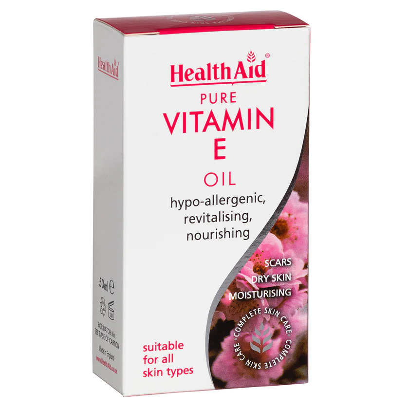 Чисто масло од витамин Е Витаминот Е е моќен антиоксиданс со одлични својства против стареење; тој е одличен чистач на слободни радикали, од витално значење за заштита на клетките на кожата од загадување, стареење на клетките, УВ светлина и елементи кои произведуваат слободни радикали кои ги оштетуваат клетките. HealthAid® го формулира ова масло користејќи висококвалитетен витамин Е , кој лесно се апсорбира и помага кожата да остане здрава, хидрирана, негувана и сјајна. Исто така е идеален за изгореници, лузни и стрии.