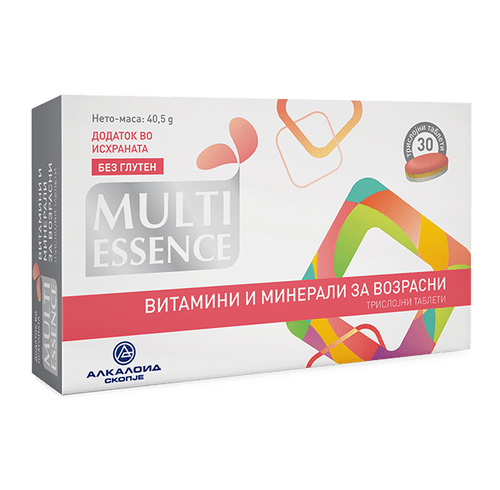 Дејство Трислојните таблети MULTI ESSENCE Витамини и минерали за возрасни, ја обезбедуваат потребната количина витамини и минерали, со цел да се задоволат зголемените потреби на организмот. Витаминот Ц, витаминот Б1, витаминот Б2, витаминот Б6, витаминот Б12, ниацинот, пантотенската киселина, биотинот, калциумот, магнезиумот, железото, манганот, бакарот, јодот и фосфорот придонесуваат за нормално искористување на енергијата. Витаминот Ц, витаминот Б2, витаминот Б6, витаминот Б12, ниацинот, пантотенската киселина, фолната киселина, магнезиумот и железото придонесуваат за намалување на заморот и на исцрпеноста. Витаминот Ц, витаминот Б1, витаминот Б2, витаминот Б6, витаминот Б12, ниацинот, биотинот, магнезиумот, бакарот и јодот придонесуваат за нормално функционирање на нервниот систем Витаминот Ц, витаминот Б1, витаминот Б6, витаминот Б12, ниацинот, фолната киселина, биотинот и магнезиумот придонесуваат за нормална психолошка функција. Железото, јодот и цинкот придонесуваат за нормална когнитивна функција. Витаминот Ц, витаминот А, витаминот Д, витаминот Б6, витаминот Б12, фолната киселина, железото, цинкот, бакарот и селенот придонесуваат за нормална функција на имуниот систем Витаминот Ц, витаминот Б1, витаминот Б2, витаминот Б6, витаминот Б12, ниацинот, пантотенската киселина, биотинот, калциумот, магнезиумот, железото, манганот, бакарот и јодот придонесуваат за нормално искористување на енергијата. Витаминот Ц, витаминот Б2, витаминот Б6, витаминот Б12, ниацинот, пантотенската киселина, фолната киселина, магнезиумот и железото придонесуваат за намалување на заморот и на исцрпеноста. Витаминот Ц, витаминот Б1, витаминот Б2, витаминот Б6, витаминот Б12, ниацинот, биотинот, магнезиумот, бакарот и јодот придонесуваат за нормално функционирање на нервниот систем. Витаминот Ц, витаминот Б1, витаминот Б6, витаминот Б12, ниацинот, фолната киселина, биотинот и магнезиумот придонесуваат за нормална психолошка функција. Железото, јодот и цинкот придонесуваат за нормална когнитивна функција. Витаминот Ц, витаминот А, витаминот Д, витаминот Б6, витаминот Б12, фолната киселина, железото, цинкот, бакарот и селенот придонесуваат за нормална функција на имуниот систем. Витаминот Ц, витаминот Е, витаминот Б2, цинкот, манганот, бакарот и селенот придонесуваат за заштита на клетките од оксидативен стрес. Витаминот А, витаминот Б2, ниацинот и биотинот придонесуваат за одржување нормални кожа и мукозни мембрани, додека биотинот, цинкот и селенот придонесуваат за одржување нормална коса. Витаминот К, витаминот Д, калциумот, магнезиумот, цинкот и манганот придонесуваат за одржување нормални коски. Витаминот Д, калциумот и магнезиумот придонесуваат за одржување нормална мускулна функција и нормални заби. Цинкот и селенот придонесуваат за одржување нормални нокти. Витаминот А, витаминот Б2 и цинкот придонесуваат за одржување нормален вид. Витаминот Д, витаминот Б12, фолната киселина, магнезиумот, железото и цинкот играат улога во процесот на клеточна делба. Јодот и селенот придонесуваат за нормална тироидна функција. Витаминот Б6, витаминот Б12 и железото придонесуваат за нормално создавање црвени крвни клетки. Витаминот Ц дополнително придонесува за нормално создавање колаген, со цел нормална функција на крвните садови, коските, ’рскавицата, непцата, забите и на кожата. Ист
