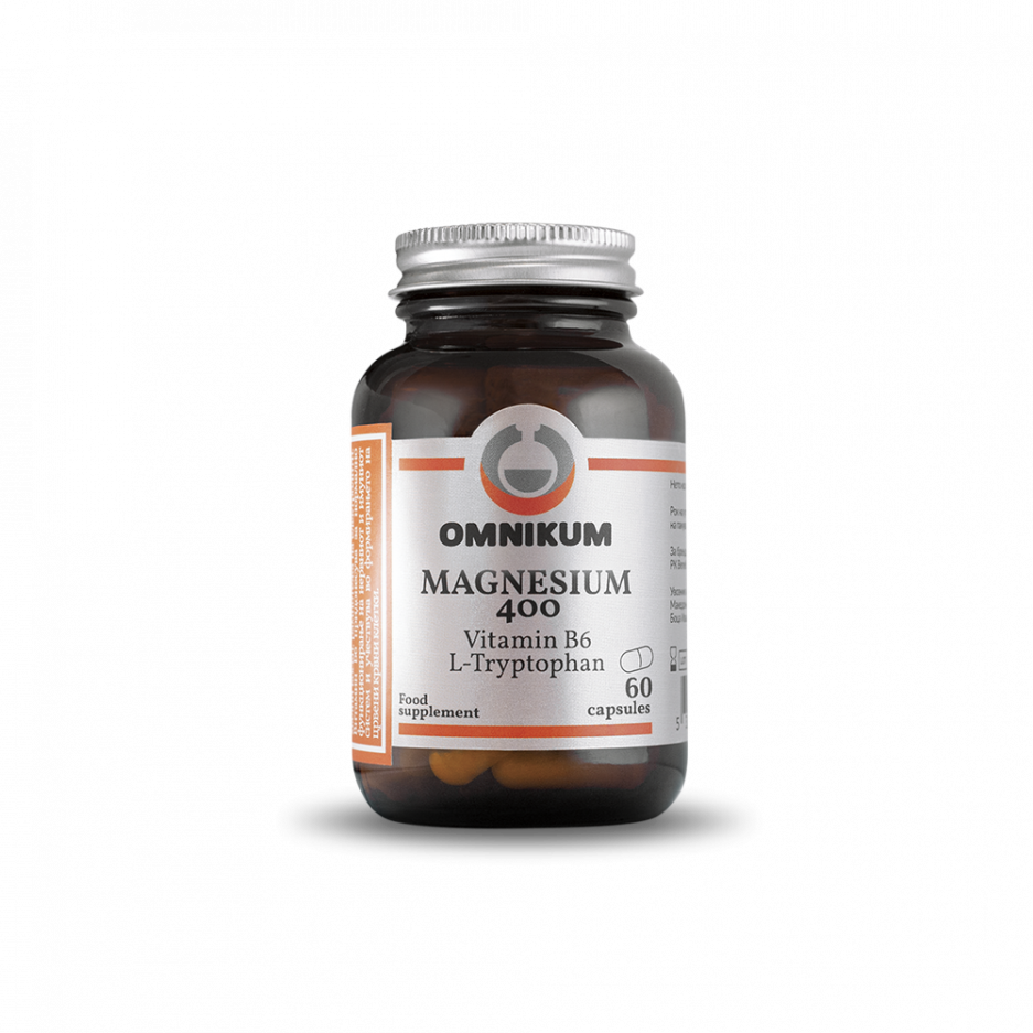Omnikum Magnesium 400 е додаток во исхрана. Секоја капсула содржи 400mg елементарен магнезиум, L-триптофан 25mg и Витамин B6 1.4mg. Учествува во релаксација на затегнатите мускули на телото, ja зголемува нивната еластичност, а исто така учествува во градба на коските.