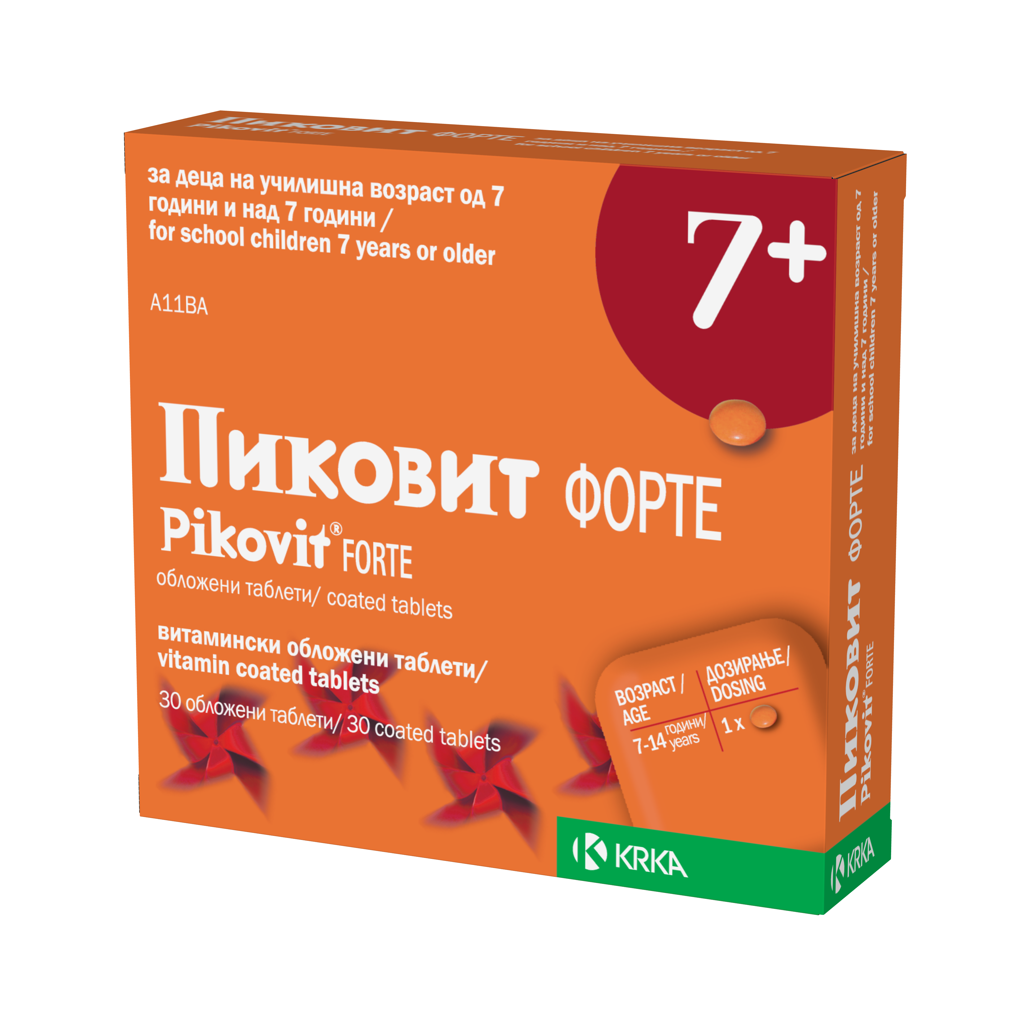 Витамините се супстанции со големо биолошко значење и се вклучени во регулирање на многубројните биохемиски процеси во човековото тело. Витамините од Б групата (Б1, Б2, Б6, Б12, пантотенска киселина и никотинамид) се вклучени во метаболизмот на јаглехидратите, протеините и мастите, како и во функционирањето на нервниот систем. Фолната киселина е неопходна за создавање, регенерација и нормално функционирање на крвните клетки. Витамин А е потребен за развој на епителните клетки и за синтезата на очниот пигмент. Витамин Д го регулира искористувањето на калциум и овозможува соодветна минерализација на коските и забите. Витамин Ц помага при апсорпција на железото и е дел од многубројните оксидативно- редуктивни процеси во телото. Витаминот Е е физиолошки антиоксиданс, кој ги штити клеточните мембрани од оштетувања и ја одржува клеточната функција. Пиковит форте не претставува замена за избалансирана и разновидна исхрана. Поради тоа, многу е важно на вашето дете да му обезбедите избалансирана и разновидна исхрана дури и за време на употребата на Пиковит форте.